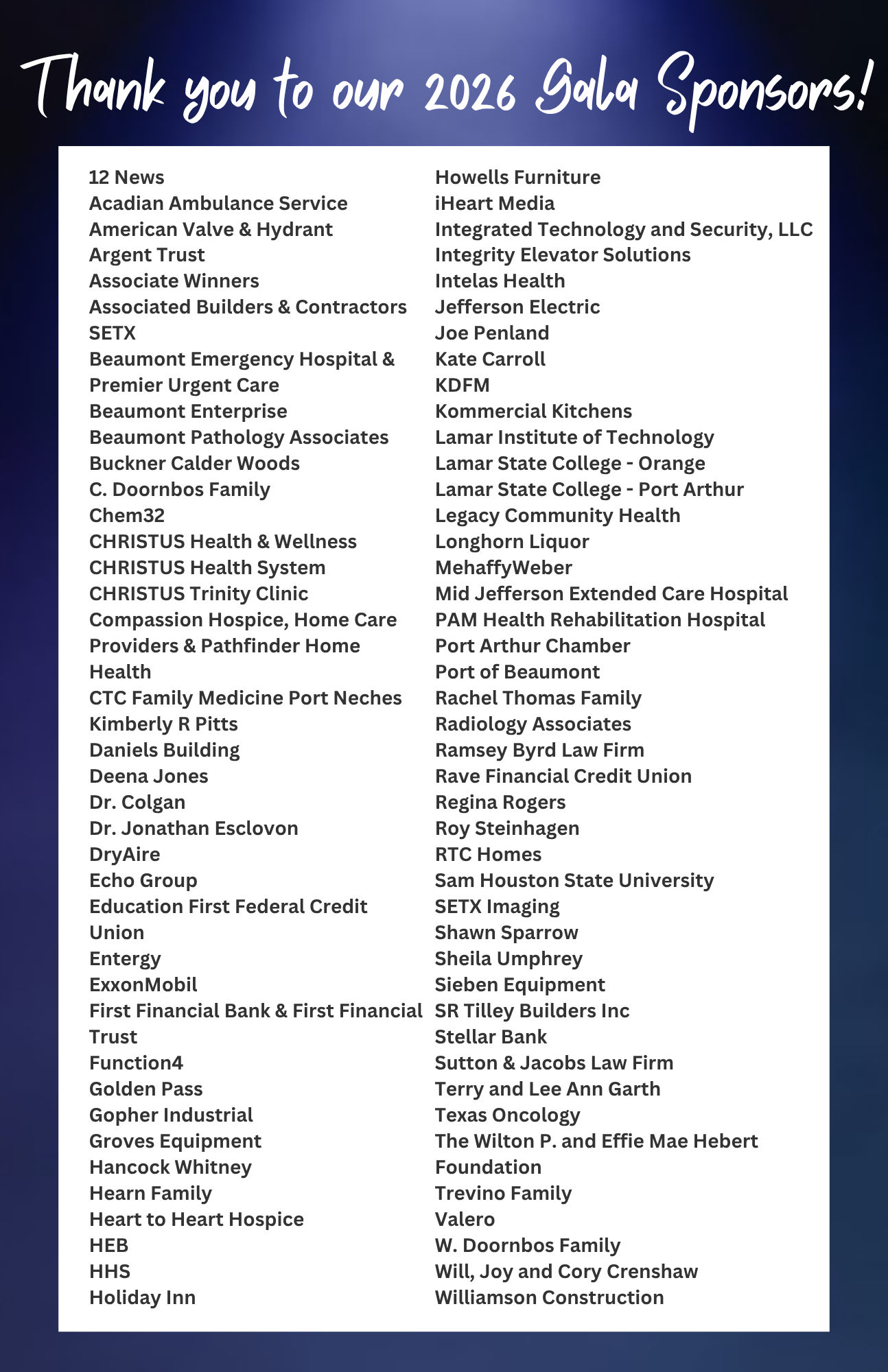 Guests were reminded that every dollar raised stays local, directly impacting patients and families in Beaumont, Mid County, Jasper, and Orange.